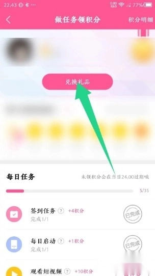 在任务中心的页面内,点击上面的“兑换礼品”选项。