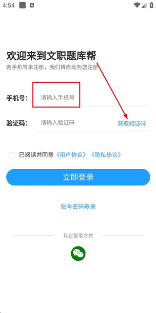 2、在登录页面输入手机号,勾选相关协议后,点击“获取验证码”按钮。
