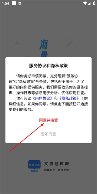 1、在使用协议与隐私政策弹窗里点击同意并接受,即可进入登录页面。