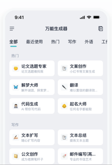 万能生成器堪称神器,能全方位满足你各类文字、语言及创意需求。它绝非普通的内容生成工具,而是集写作、翻译、职场、学术等诸多功能于一身,真正实现一站式解决难题。不管你是要撰写文章、制作报告,还是进行外语翻译、语法检查,乃至寻求编程方面的帮助,万能生成器都能迅速提供专业支持。其操作极为灵活,你可依据实际需求挑选不同功能模块,让创作过程轻松惬意。此外,万能生成器还能激发生活灵感,助力产出有趣实用的文案,既省时又省力。