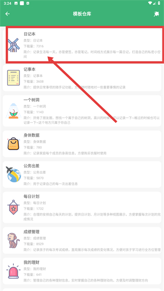 2、进入模板仓库后,选择【日记本】模板,该模板适用于通过时间线形式记录生活点滴,助力用户打造专属的私人记录空间。