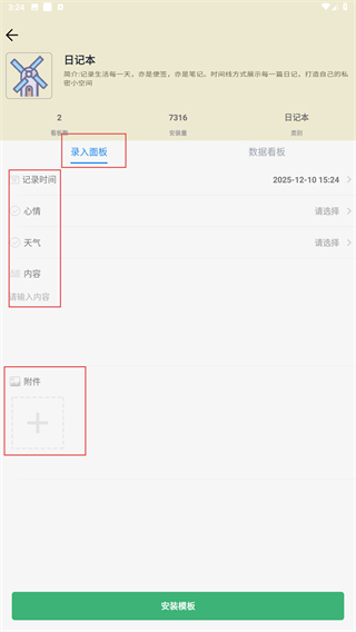 3、进入【日记本】的【录入面板】,填写【记录时间】【心情】【天气】【内容】,还可添加附件,完成后套用模板。
