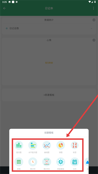4、进入【日记本】的数据看板页面后,点击【+新建看板】按钮,接着从【直方图】【饼图】等可选样式里进行挑选,即可生成用于展示日记数据的可视化看板。
