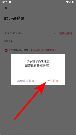 4、要是手机号还没注册,在弹出的提示框里,点击“现在注册”按钮。