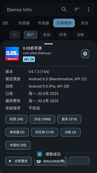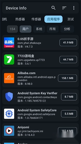 1、用户应用程序、已安装应用程序、应用程序版本号、最低适配操作系统、目标适配操作系统、安装时间、更新时间、权限设置、运行活动、后台服务、应用提供商、广播接收器