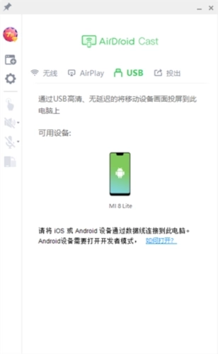 要开始投屏您的Android设备,可点击AirDroidCast桌面端的“USB”选项,接着在可用设备列表里选中您的Android设备即可。