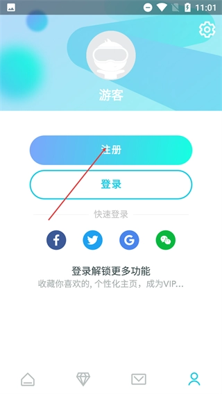 1、进入游客界面后,您可以点击【注册】按钮来启动账号注册流程,也能够选择【微信】等第三方平台进行快速登录。
