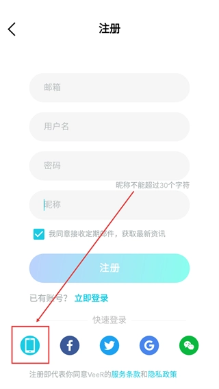 2、在注册页面选择手机注册方式时,需要填写邮箱、用户名、密码等信息,同时昵称长度不得超过30个字符。