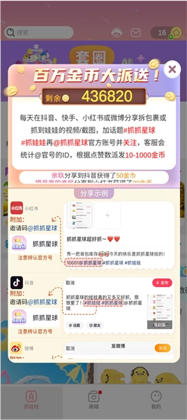【星球社区】:全新社区功能已正式上线啦!欢迎大家来这里分享在星球上收获的满满快乐,尽情展示你高超的抓娃娃技艺,说不定还能收获超多粉丝哦!