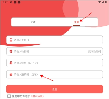 2、点击“注册”,在下方就能填写邀请码啦。