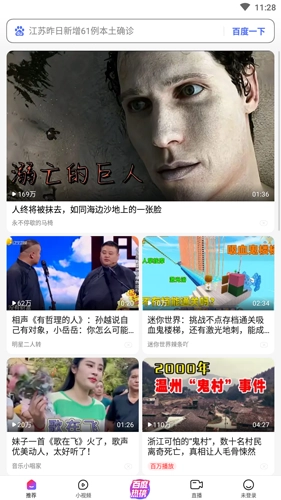 2.百度看看的搜索功能与大家平时用的“百度一下”有所不同。这里的“百度一下”专门针对视频内容进行搜索,不会展示图文等其他类型的信息,搜索类别也仅包含“视频”“小视频”“直播”等。搜索结果则采用智能化的Feed流形式呈现。