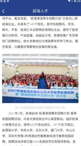 2.前海人才环境介绍、就业岗位的查看与申请、网上办事服务的查询等内容。