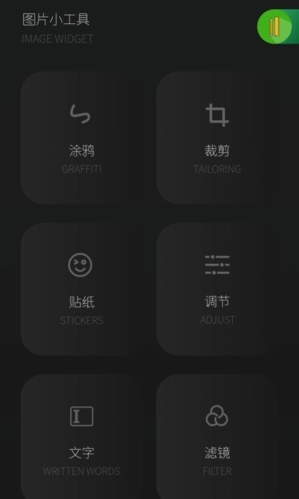 1、软件里主要包含涂鸦、裁剪、贴纸、调节、文字、滤镜这些功能,用户只要逐个尝试使用就能熟悉它们——只需打开每个功能,导入图片,就能进行快速操作。