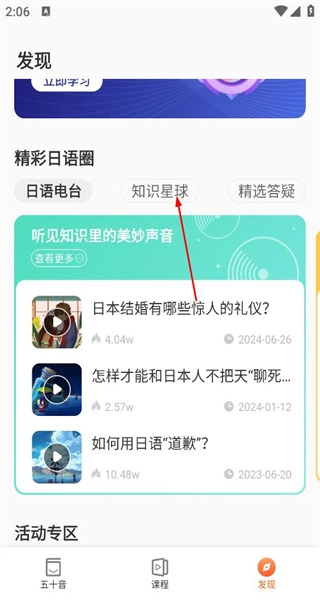 2、进入发现页面后,找到精彩日语圈的分类板块,点击其中的知识星球标签,即可切换至对应的内容展示区域。