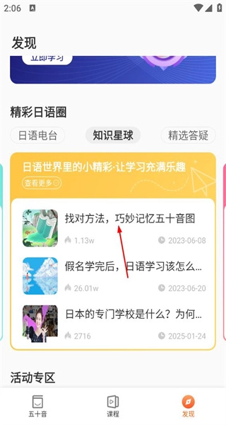 3、在知识星球板块,找到《找对方法巧妙记忆五十音图》这篇内容并点击进入其详情页面。