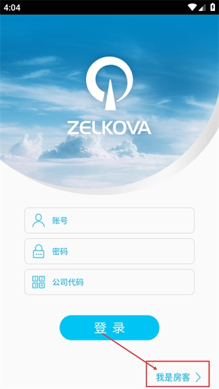 1、在ZELKOVA登录页面,既可以填写【账号】【密码】【公司代码】后点击【登录】,也可以点击【我是房客】进入房客专属操作流程。