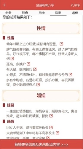 易演乾坤是苏州永祥晖网络科技有限公司推出的周易算命应用,集成了生辰八字解析、起名、黄历查询、解梦等实用功能。用户只需输入具体需求与条件,即可获得精准推算的最优结果,所有功能均可免费使用,让您轻松获取专业的周易测算服务。该软件支持专业排盘算命,能够验证过往运势、出生背景、六亲关系、婚姻状况、事业发展、财运走向及功名前景;同时公开了上千条基于八字推演的秘法口诀与算法,帮助用户快速掌握算命技巧,实现对命理的清晰认知。