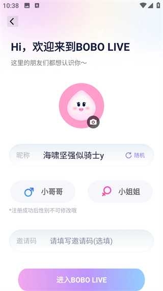 3、首次登录时,输入昵称并选择性别后,即可直接进入主页。