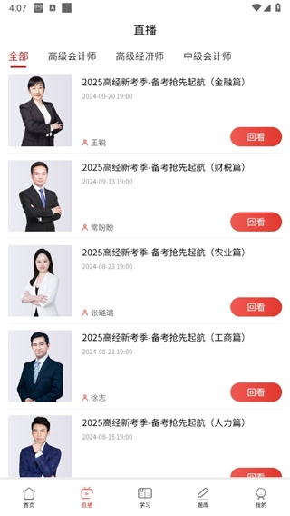 2、在直播页面中,可查看高级会计师、高级经济师及中级会计师的回放内容。