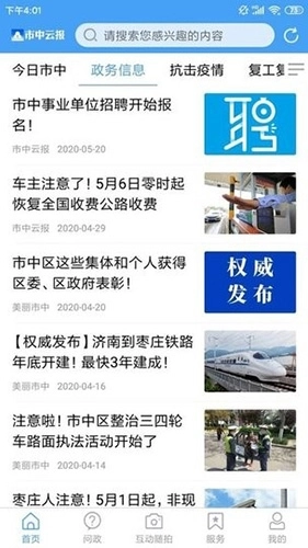 这款软件除了提供热点新闻阅读功能外,还整合了海量阅读资源,为用户带来全方位的服务体验。市中云报支持多种形式的问政互动渠道,方便用户随时随地参与相关讨论。它的综合性服务内容覆盖了政务服务、生活服务等多个领域的需求,让用户享受到便捷的线上服务。无论在什么时间、什么地点,市中云报都能直接推送视频、生活资讯,满足用户对各类话题的需求。