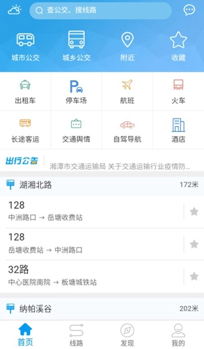 湘潭交通仅提供湘潭市的公交详情,首页就能看到附近的公交信息,若想查询具体的公交路线,点击上方的搜索框即可。