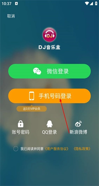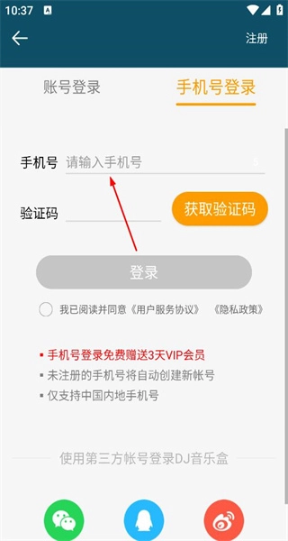 4、进入账号登录页面,输入账号并获取验证码,勾选相关协议后,点击登录按钮即可完成操作。