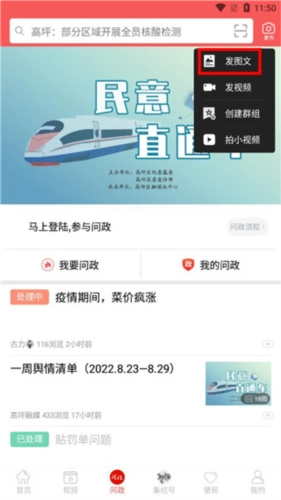 2、进入问政窗口后,依次点击右上角的【发布】按钮,再点击【发图文】选项。