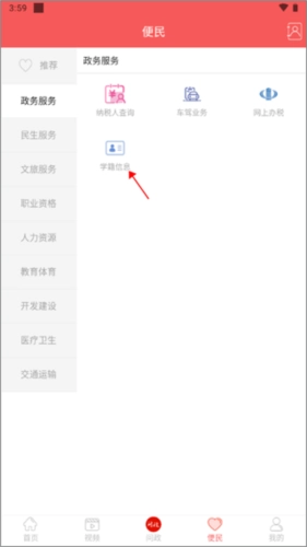 1、从首页进入便民界面,点击政务服务板块下的“学籍信息”选项。