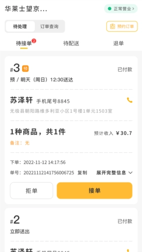 全面订单查询:商家可随时查看订单详情,涵盖待结单、待配送、退单等各类订单状态,方便及时追踪订单进展。