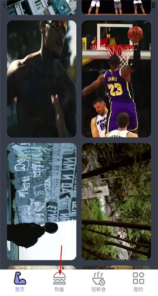 打开软件后,进入首页,浏览内容板块,点击热量选项进入热量管理页面。