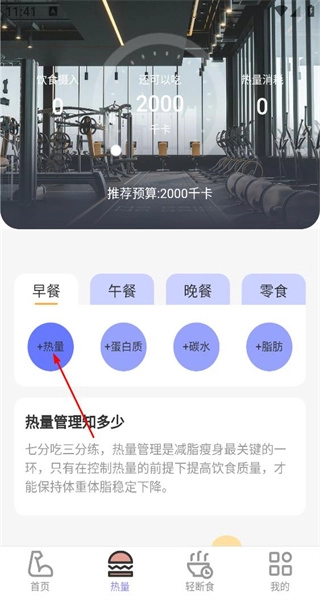 2、进入热量页面,查看推荐的热量预算和餐食分类,然后点击热量按钮来设置早餐的热量摄入值。