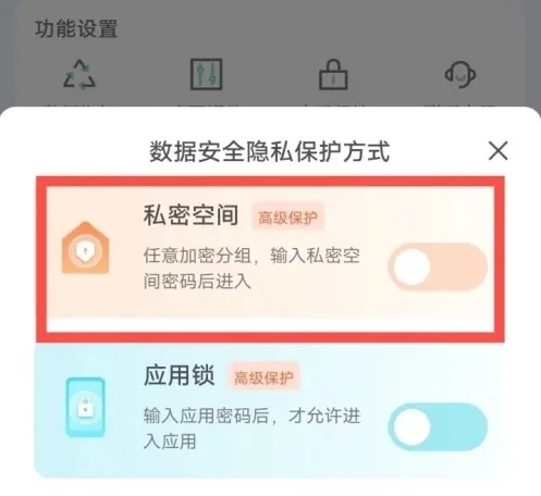 3、进入密码保护页面,开启【私密空间】即可。