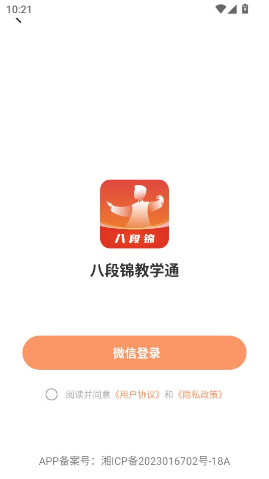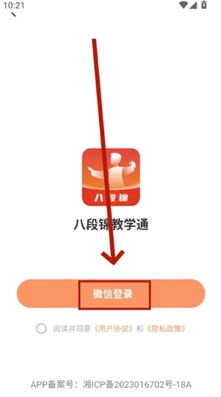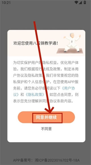 1、首先打开八段锦教学通,在软件提示的相关协议中点击同意并进入。