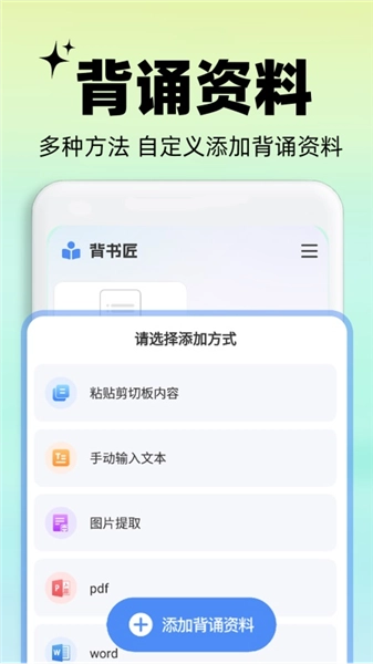 2、背书匠的使用方法十分简单,用户只需打开软件完成账号注册与登录,进入页面后点击添加资料,就能依据自身需求挑选不同的添加方式。