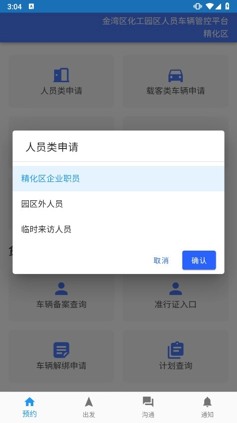 用户可以根据需要选择人员类申请、工程类车辆申请、载客类车辆申请或货运车辆申请。
