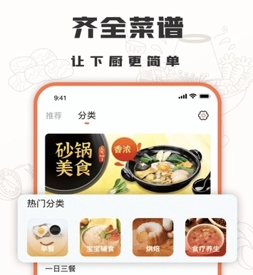 创意菜、糕点烘焙、可口面食、网红快手菜、瘦身套餐、下午茶等等热门菜谱,各大菜谱下面又有超多分类,让你跟着教程慢慢学,一步一步的学会如何做菜!