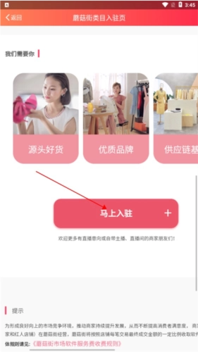 1、在本站打开蘑菇街商家版并进入软件,点击“马上入驻”进入对应页面。