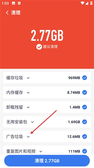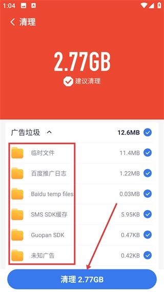 3、展开具体分类(例如广告垃圾)能够查看细分文件,确认无误后点击【清理2.77GB】按钮即可执行清理操作。