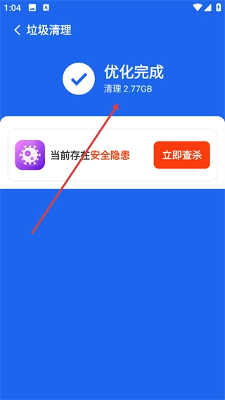 4、清理结束后,页面会显示“优化完成”的提示,告知已清理2.77GB的垃圾,并且能查看安全隐患的相关提示。