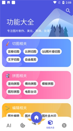 4、点击功能大全,即可看到切图相关、拼图相关以及编辑相关的功能可供使用。