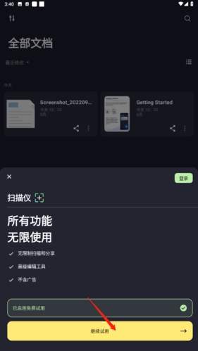 2、开启试用功能,只需点击“继续试用”选项,就能享受去水印、等服务。