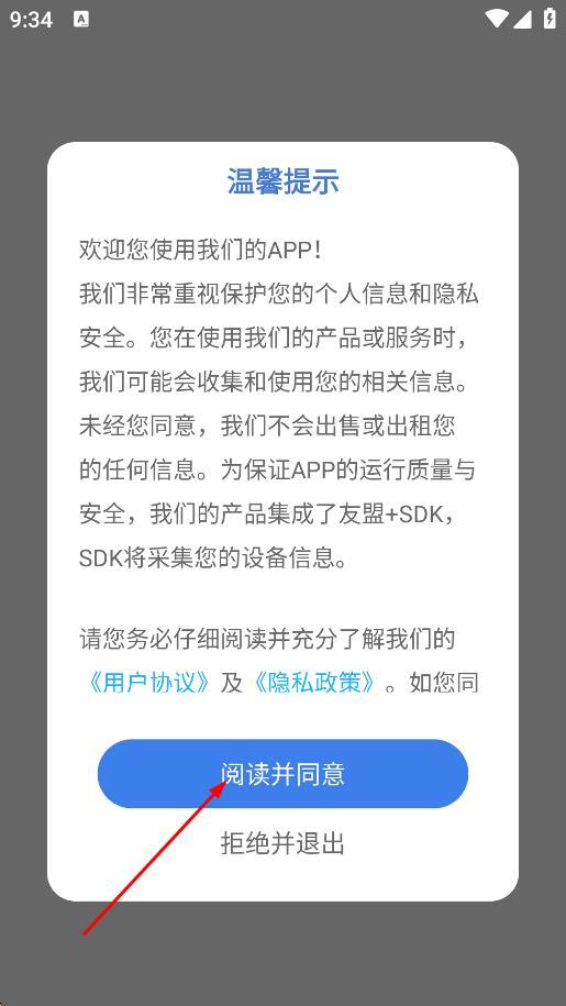 1、在温馨提示弹窗里,点击“阅读并同意”按钮,即可进入应用首页。
