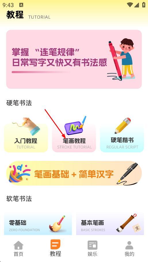 3、在教程页面,点击笔画教程选项,即可进入笔画教程的学习页面。