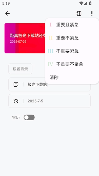 3、对名称和时间进行设置,还能点击右上角的感叹号来配置四象限。