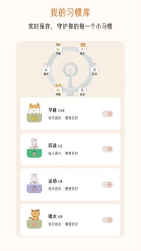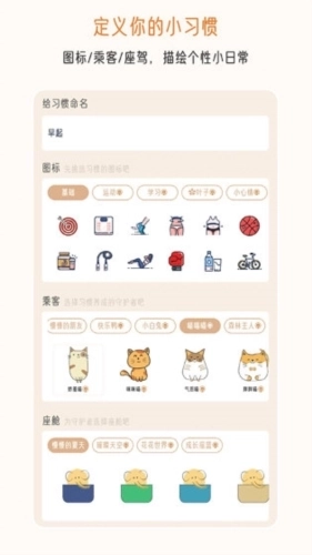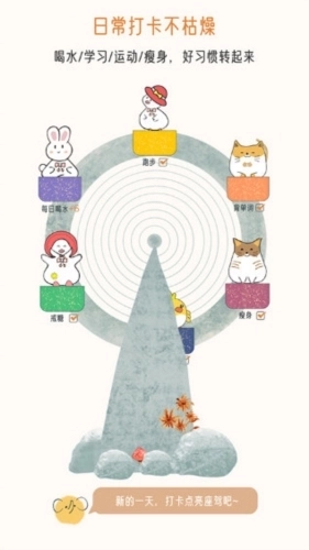【装扮打卡目标】选择摩天轮的乘客,它是你日常的守护者,涵盖计划、习惯、备忘等内容,乘客可以是小主角小象慢慢,也可以是河马大嘴;还能挑选心仪的座驾,有夏日主题、糖果色主题,这些装饰能为你的坚持增添一份仪式感。要是你每天记单词,就选记忆力超棒的乘客猩猩富二袋;要是你想提醒自己每天喝8次水,选小象慢慢准没错,它最能喝了;如果你在减肥瘦身,猫猫小乔再合适不过了。