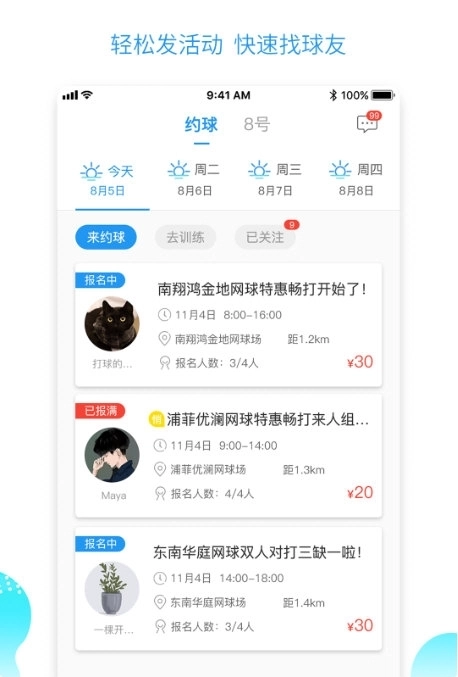 【精准订场】已进驻多个社区,开展智能场地翻新服务。依托LBS定位系统与个性化匹配功能,为您就近推荐专业网球场地,助您快速完成订场;此外,我们还提供贴心的天气服务,进一步为您的网球运动带来便利。