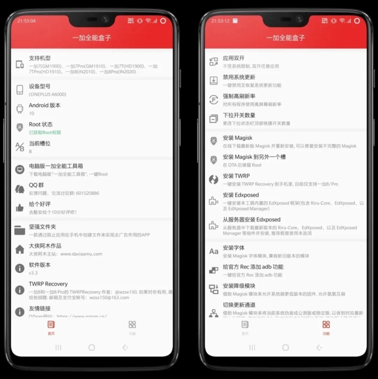 一加全能盒子的多数功能,像安装Magisk、EdXposed、开启全局高刷新率、关闭系统更新等,都要求设备先获取Root权限(建议使用Magisk20.4及更高版本)。要是设备没有Root,一些功能可能无法正常使用,或者会弹出未Root的提示信息。
