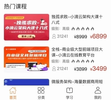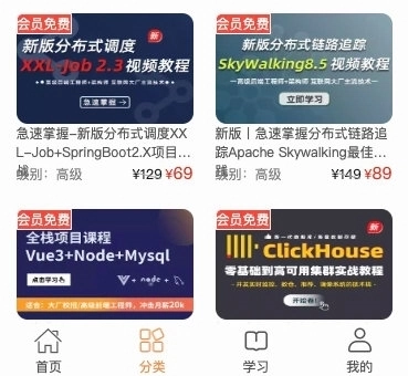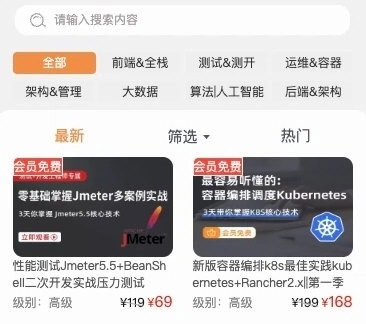 课程分类:包含前端开发、全栈开发、测试与测开、运维与容器化、架构设计、大数据技术、后端开发等领域。