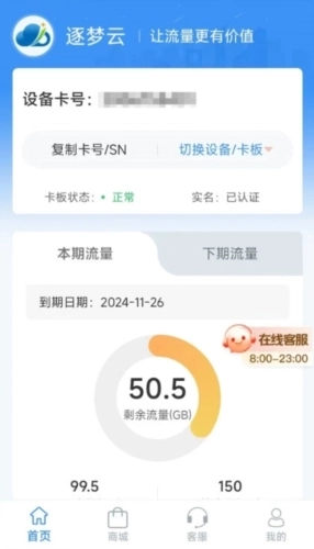 3、流量直充、使用明细查询、断网预警等功能,助力您实时管理流量状况,不仅能随时便捷订购流量,还可实时掌握设备流量的使用动态。