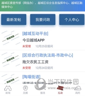 1、打开今日越城,在新闻栏目里找到“互动”按键并点击它;